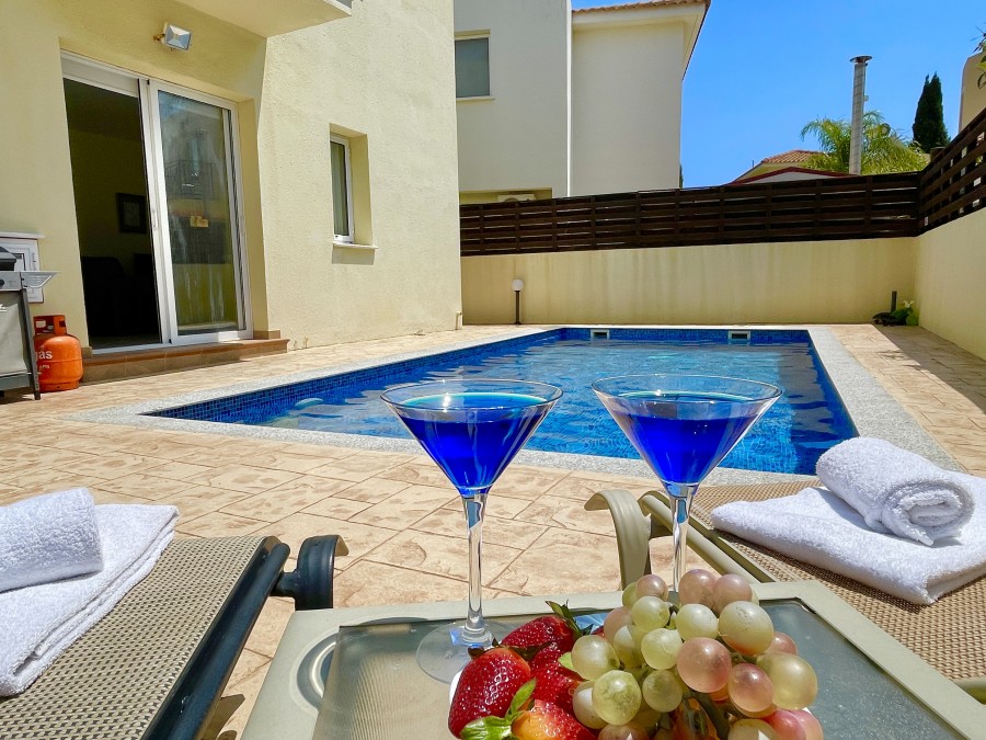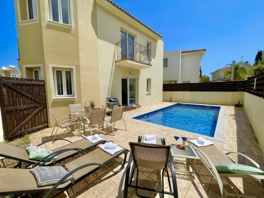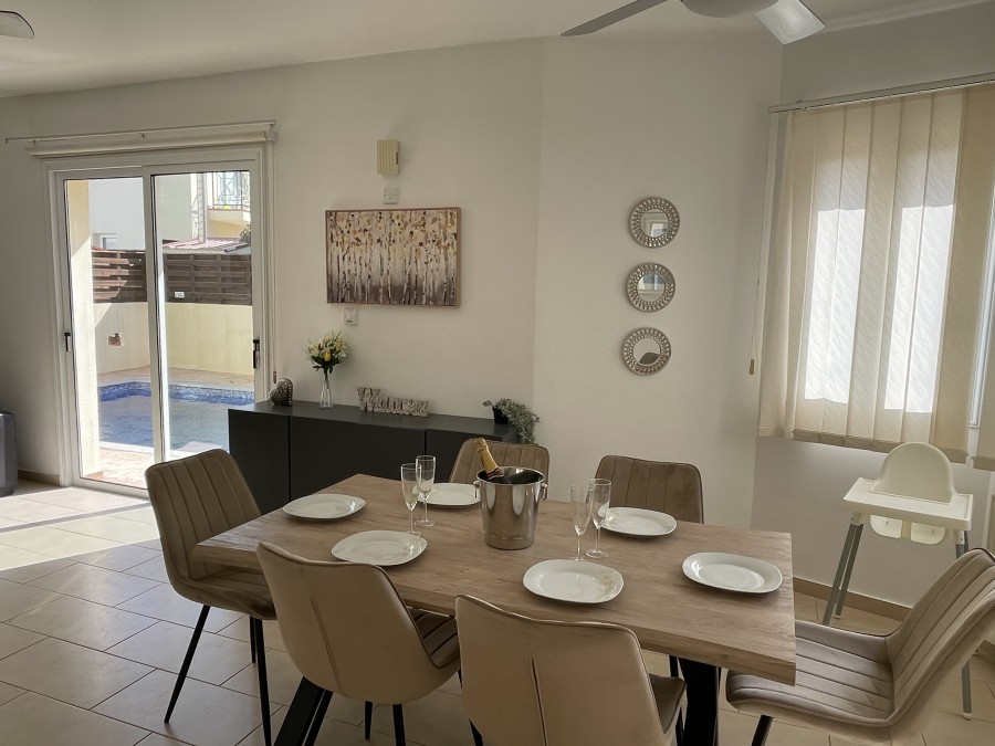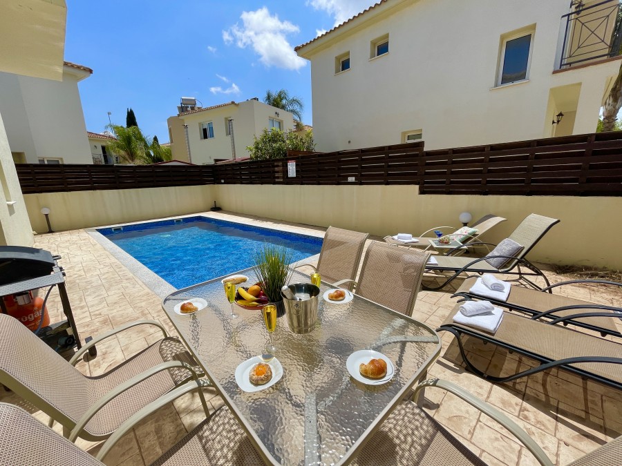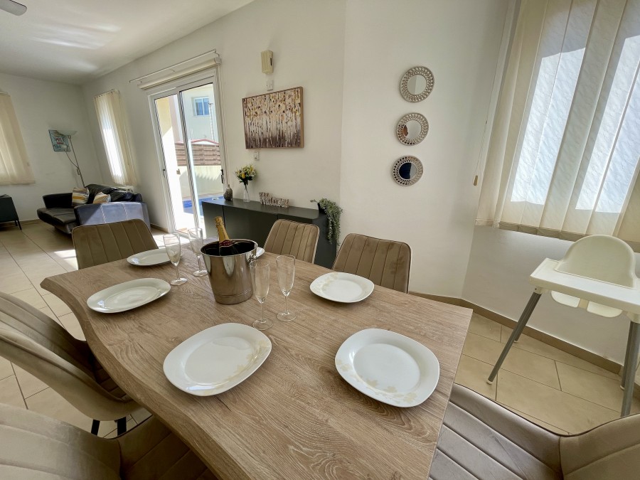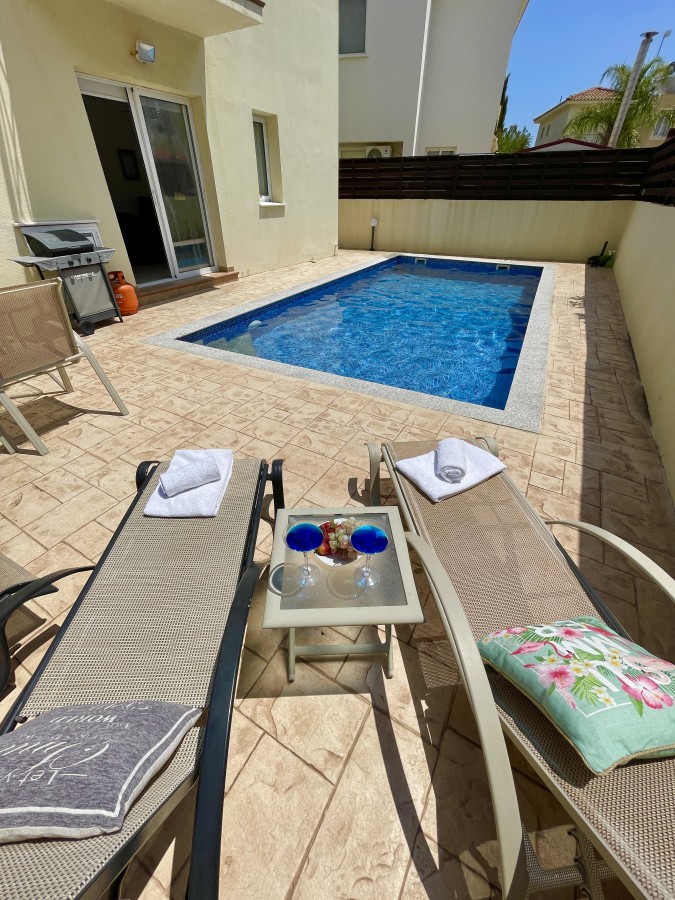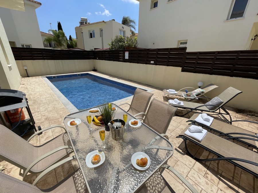 The villa is fully equipped for a self-catering holiday and features a private swimming pool, outdoor dining table and chairs, and sun beds. It offers air-conditioning throughout, free WiFi, and an international TV system with channels like BBC, ITV, Sky Sports, and major European channels.