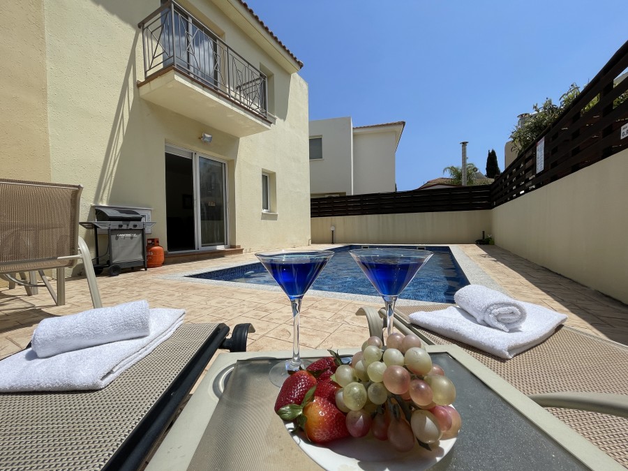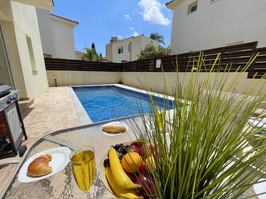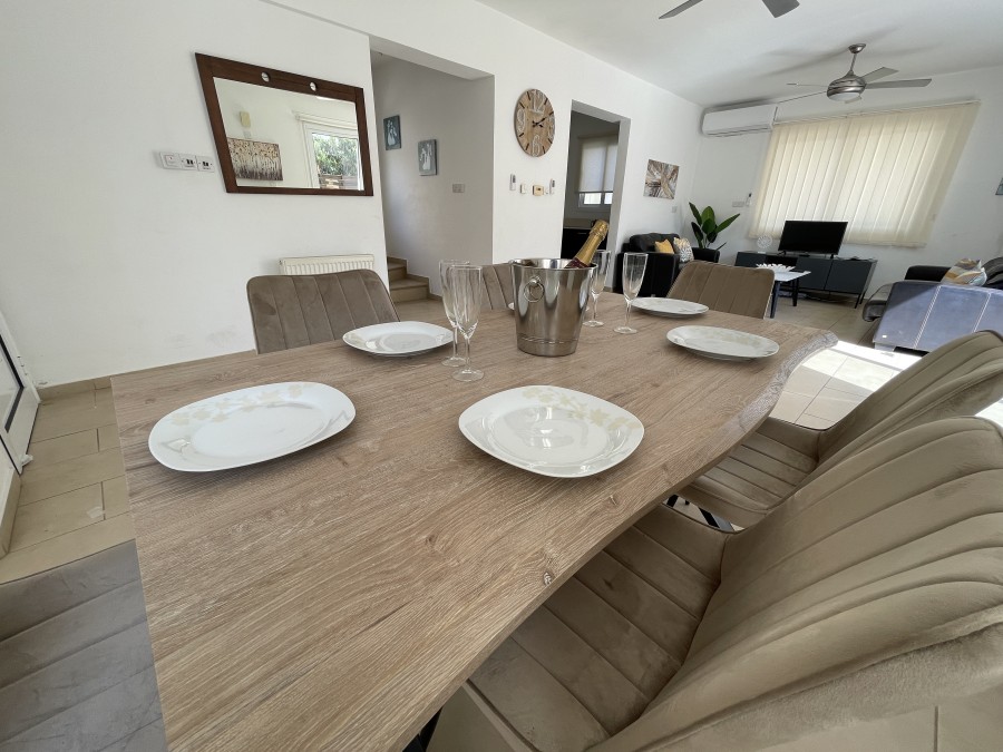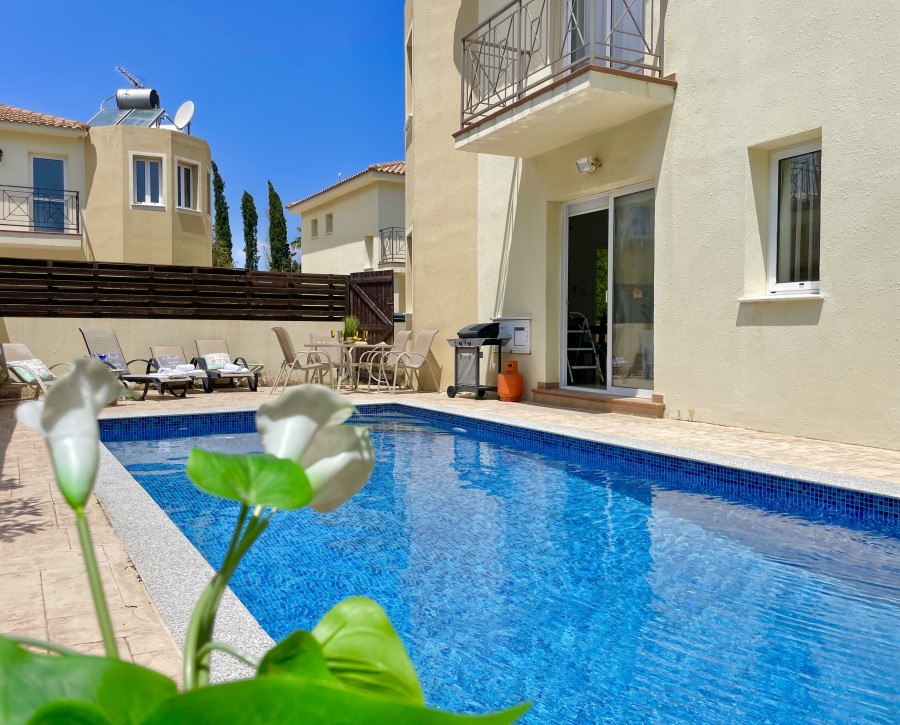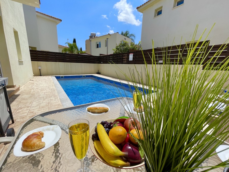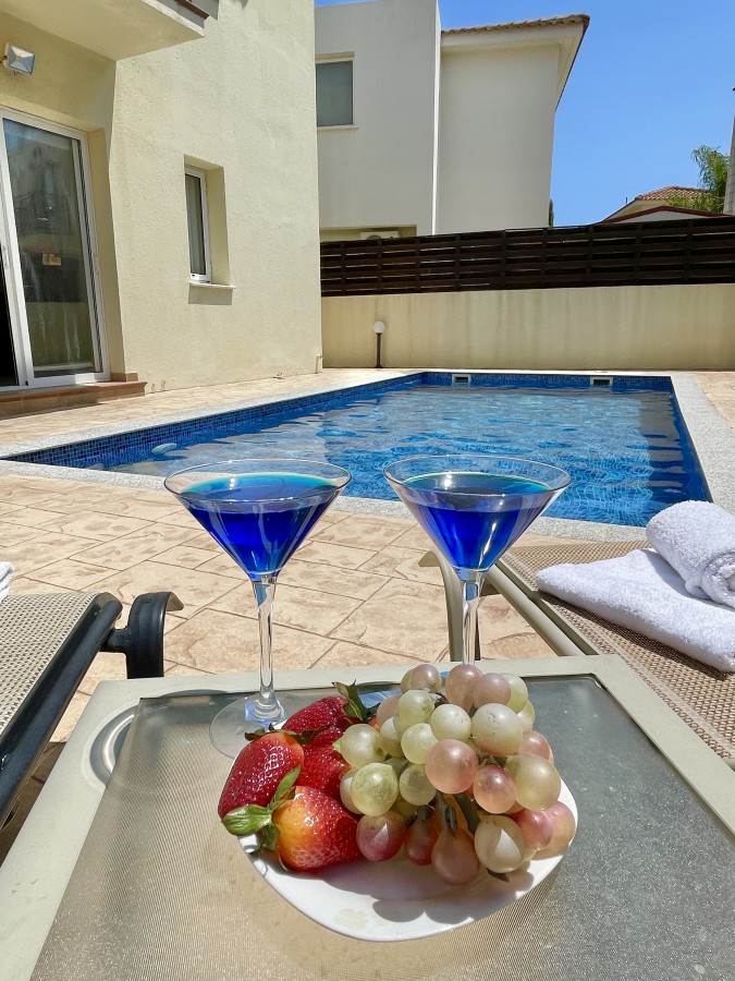 The villa is fully equipped for a self-catering holiday and features a private swimming pool, outdoor dining table and chairs, and sun beds. It offers air-conditioning throughout, free WiFi, and an international TV system with channels like BBC, ITV, Sky Sports, and major European channels.