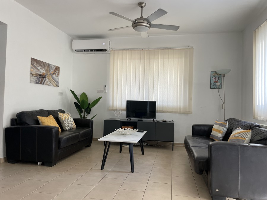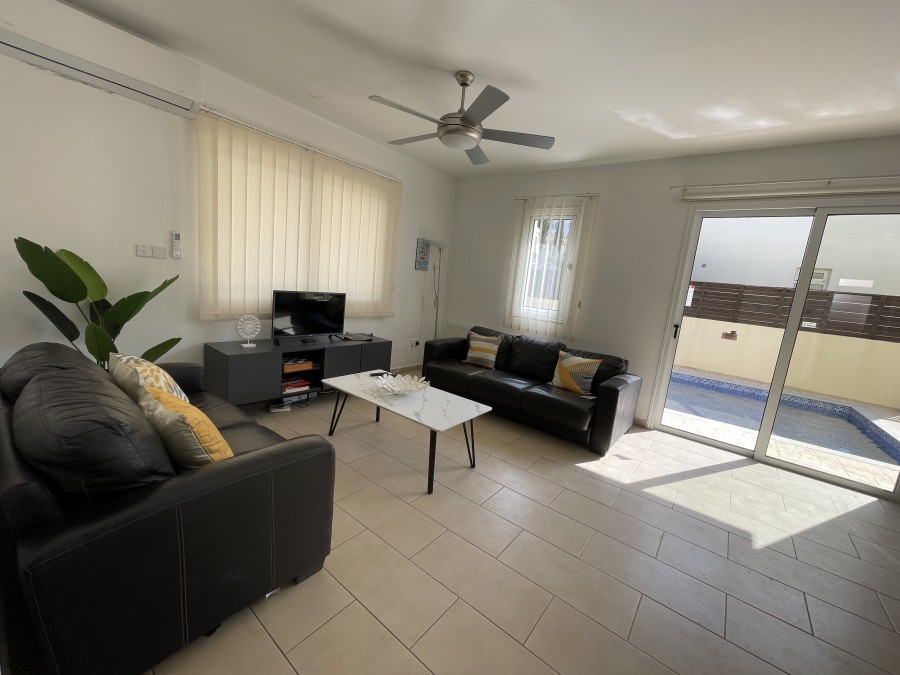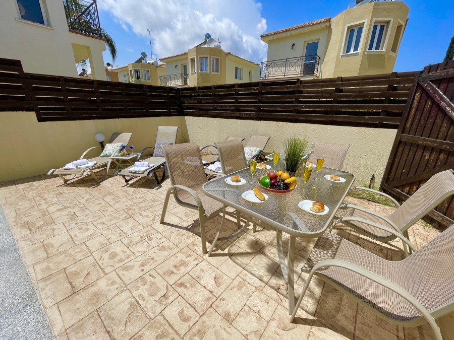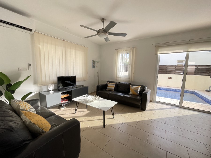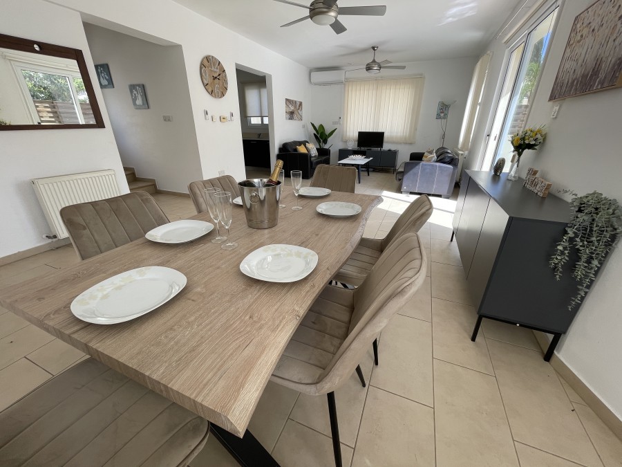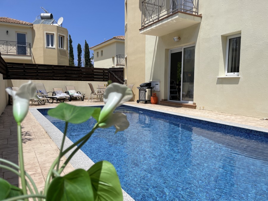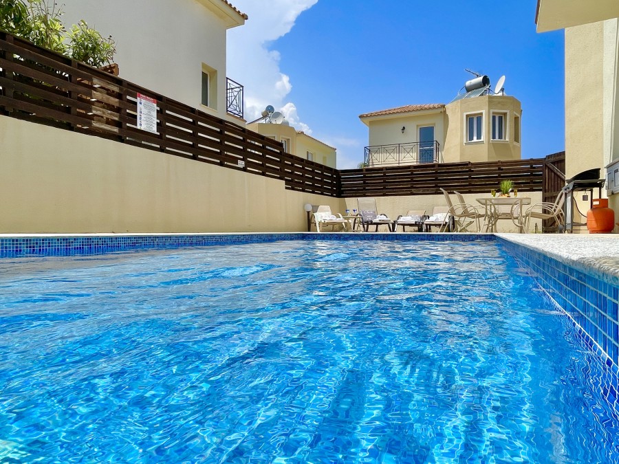 The villa is fully equipped for a self-catering holiday and features a private swimming pool, outdoor dining table and chairs, and sun beds. It offers air-conditioning throughout, free WiFi, and an international TV system with channels like BBC, ITV, Sky Sports, and major European channels.