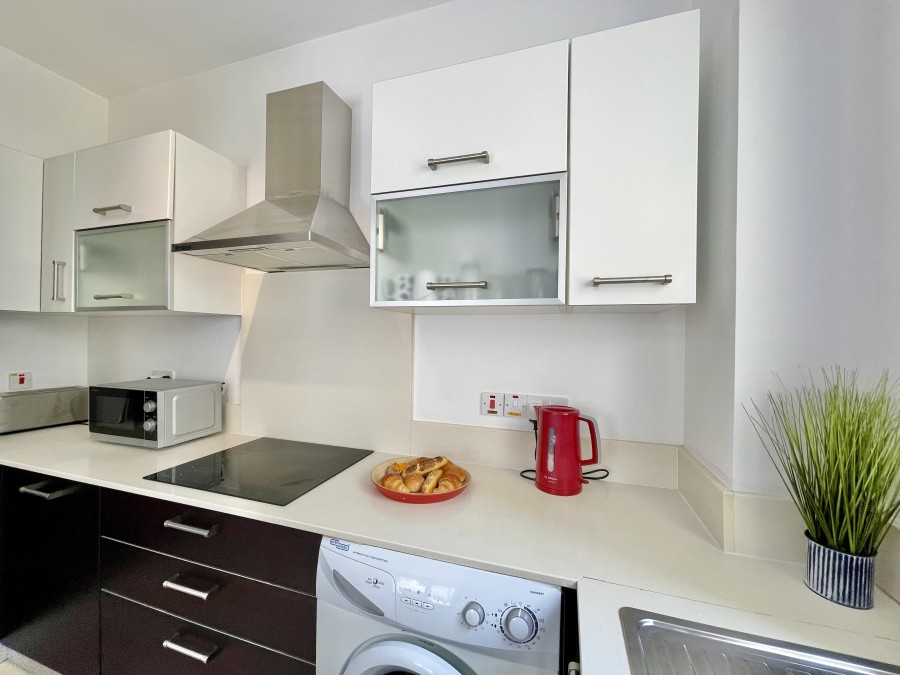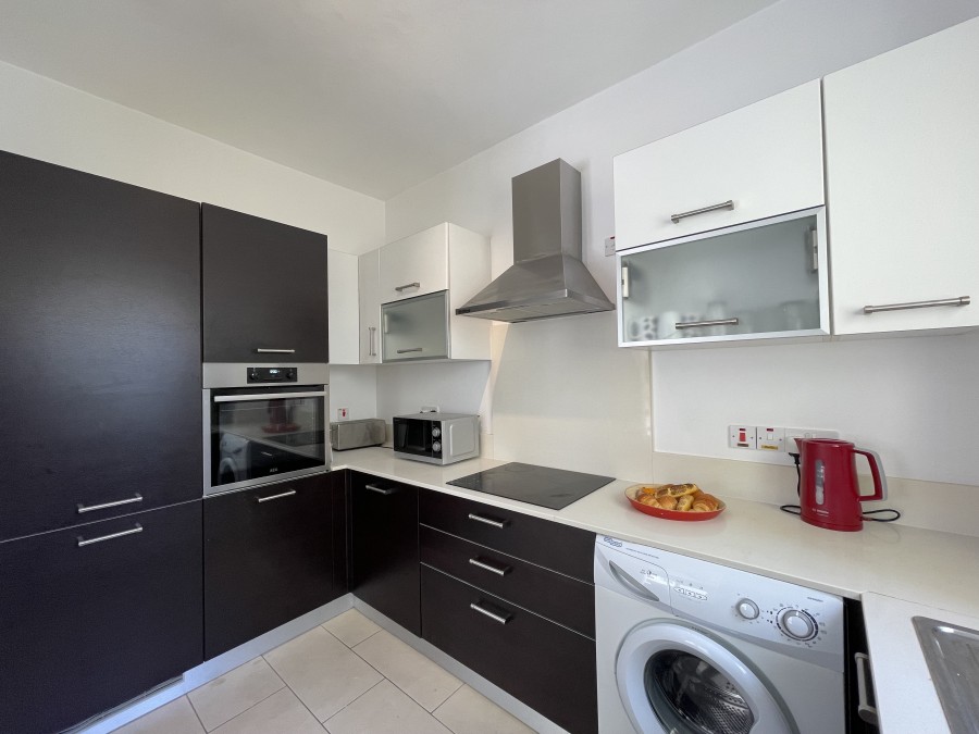 Bedroom 1 has a king size double bed with an ensuite bathroom, Bedroom 2 has a double bed, and bedroom 3 has two single beds.